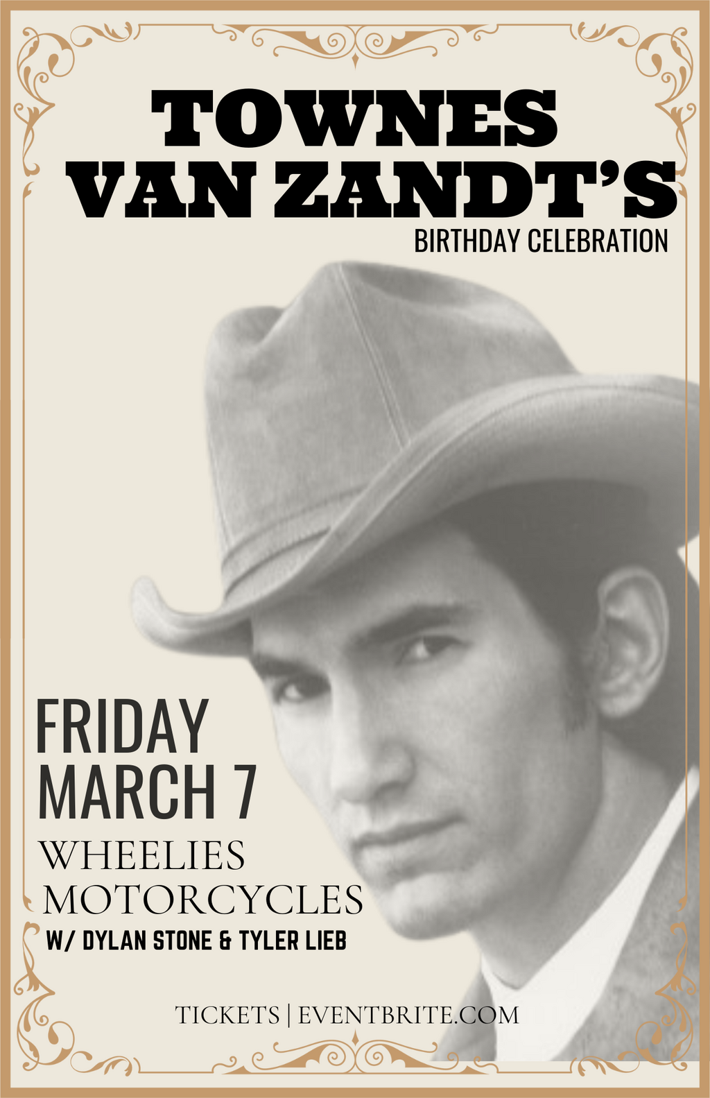 Fri. March 7th 2025 8:00 PM doors at 7:00 PM (All Ages) ~Townes Van Zandt's Birthday Celebration